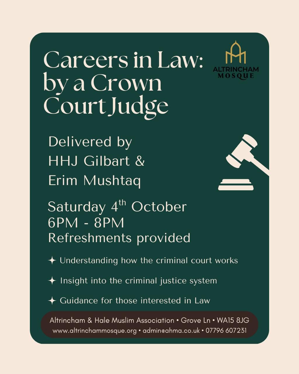 Careers In Law: By A Crown Court Judge Delivered By: HHJ Gilbart & Erim Mushtaq + Understanding how the criminal court works + Insight into the criminal justice system + Guidance for those interested in Law Refreshments Provided